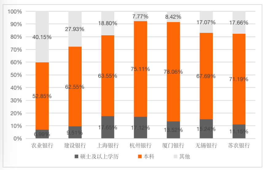 但從技術(shù)人員占比(廈門銀行、蘇農(nóng)銀行數(shù)據(jù)未披露)和員工學歷來看,國有商業(yè)銀行并不占優(yōu)勢。商業(yè)銀行技術(shù)人員占比最高的是杭州銀行,占比為12.45%;農(nóng)業(yè)銀行和建設(shè)銀行的技術(shù)人員占比分別為7.58%、8.12%;上海銀行的技術(shù)人員占比最低,為6.30%。商業(yè)銀行碩士及以上學歷的員工占比最高的是上海銀行,占比為17.65%;商業(yè)銀行本科及以上學歷的員工占比最高的是杭州銀行,占比為92.23%;而碩士及以上學歷的員工占比最低和本科及以上學歷的員工占比最低的是農(nóng)業(yè)銀行,占比分別為6.99%、59.85%。