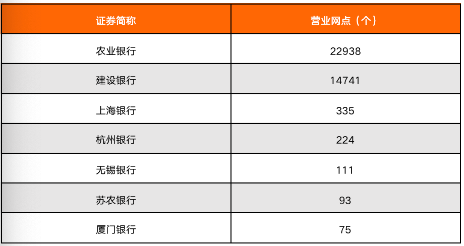 營業(yè)網(wǎng)點個數(shù)在一定水平上能反映出商業(yè)銀行的資本投入水平。農(nóng)業(yè)銀行有22938個營業(yè)網(wǎng)點,建設(shè)銀行有14741個營業(yè)網(wǎng)點;城市商業(yè)銀行和農(nóng)村商業(yè)銀行由于地域限制,能夠設(shè)立的營業(yè)網(wǎng)點數(shù)量有限,其中,營業(yè)網(wǎng)點數(shù)量最少的是廈門銀行,僅有75個。