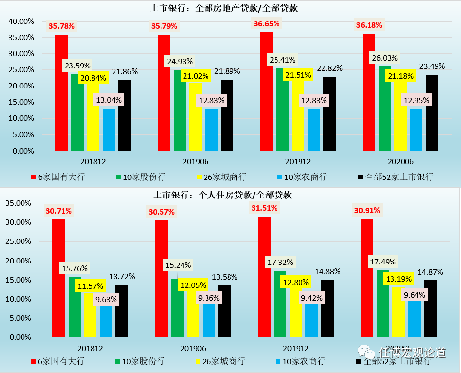 (1)截至2020年6月,6家國有大行的房地產(chǎn)貸款占比高達(dá)36.18%,2018年與2019年分別為35.78%和36.65%,整體上一直保持36%上的高位。