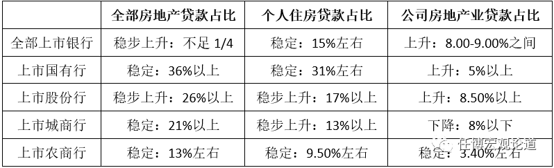 (六)322號文僅提及個人住房貸款和全部房地產(chǎn)貸款,同時從比例設(shè)置來看,第一檔(國有行)、第二檔(包括3家城商行的中型銀行)、第三檔的對公端房地產(chǎn)貸款占比上限分別應(yīng)不低于7.50%、7.50%和5%,第四檔與第五檔的對公端房地產(chǎn)貸款占比上限亦分別應(yīng)不低于5%。因此我們大致可以這樣理解,322號文同時對個人住房貸款和對公端房地產(chǎn)業(yè)貸款比例提出了具體約束要求。
