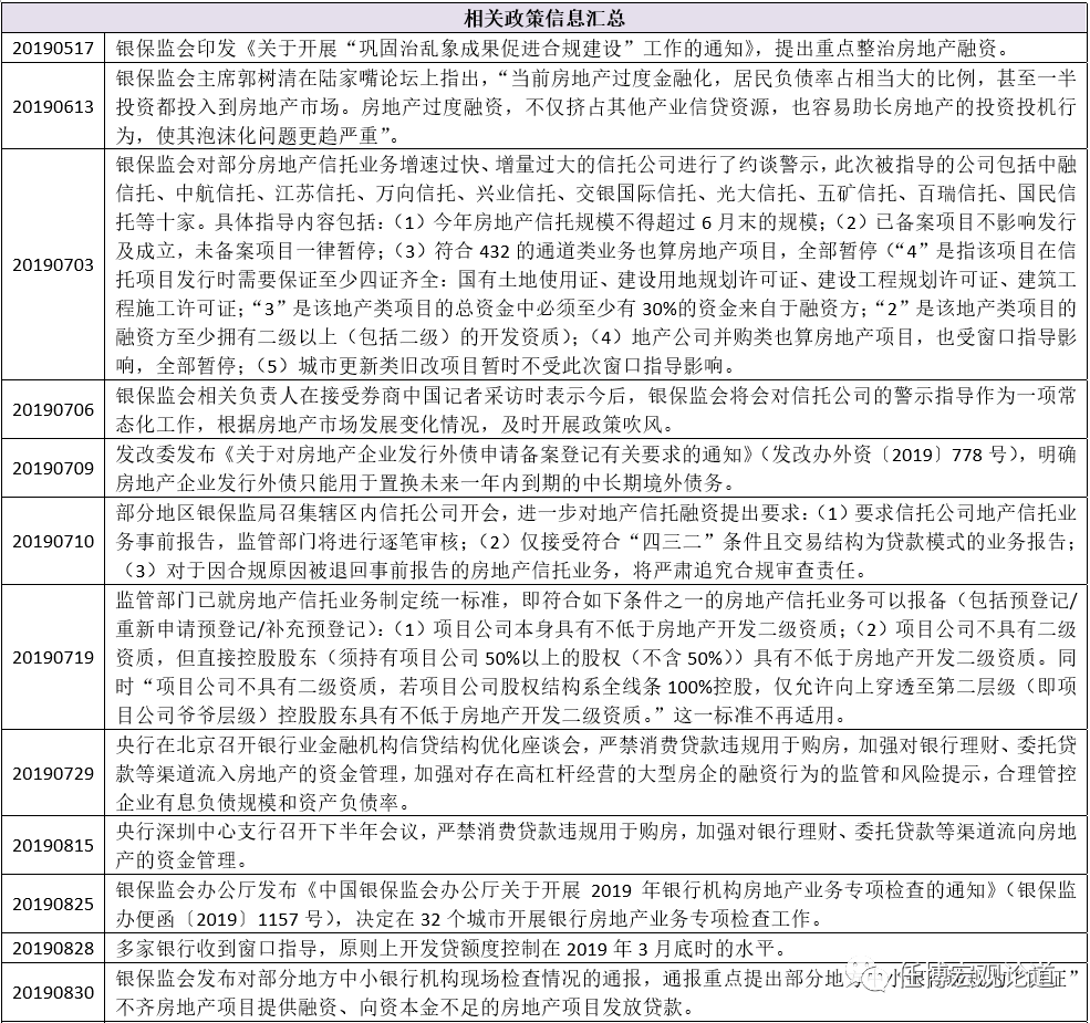 2、2019年政策層面對房地產(chǎn)業(yè)務(wù)的嚴(yán)監(jiān)管始于中美貿(mào)易摩擦形勢開始明顯惡化(2019年5月5日)、包商銀行被接管以及貨幣政策層面再次放松之后,而2019年6月13日銀保監(jiān)會主席郭樹清在陸家嘴論壇上提示房地產(chǎn)金融業(yè)務(wù)風(fēng)險這一事件則正式拉開了房地產(chǎn)行業(yè)嚴(yán)監(jiān)管的大幕,隨后整個7月份的房地產(chǎn)政策監(jiān)管信息便比較集中,主要體現(xiàn)在房地產(chǎn)信托融資、房企境外發(fā)債等等。