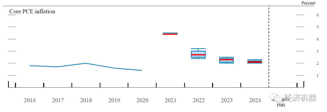 會(huì)議預(yù)測(cè)利率中樞抬升。會(huì)議預(yù)計(jì)2022年利率到1.9%(去年預(yù)測(cè)為0.9%),2023年年底利率將達(dá)到2.8%(去年為1.6%),2024年年底保持在2.8%(去年為2.1%),長(zhǎng)期利率預(yù)期中值為2.4%(去年為2.5%)。整體利率中樞較12月有明顯提升。