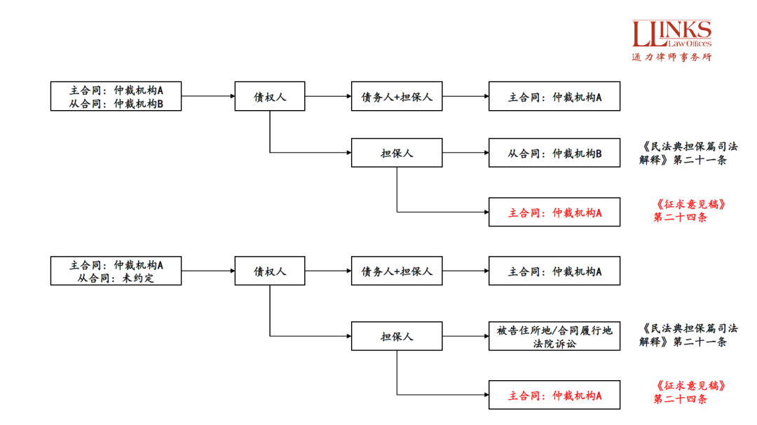 雖然同樣是“從隨主走”, 《民法典擔(dān)保篇司法解釋》其實(shí)區(qū)分了兩種不同的情形, 即同時(shí)起訴債務(wù)人和擔(dān)保人和僅起訴保證人, “從隨主走”的原則僅適用于同時(shí)起訴債權(quán)人和擔(dān)保人的情況, 如果僅起訴保證人, 仍然需要根據(jù)保證合同約定的爭(zhēng)議解決方式確定主管和管轄事項(xiàng)。但《征求意見稿》卻并沒有作上述兩種情況的區(qū)分, 即只要主合同約定了仲裁條款, 哪怕是僅對(duì)保證人提起仲裁, 仍然需要按照主合同的仲裁條款確定管轄。這就導(dǎo)致了在僅起訴保證人的情況下, 兩者對(duì)于案件的管轄問(wèn)題會(huì)給出截然不同的結(jié)論: