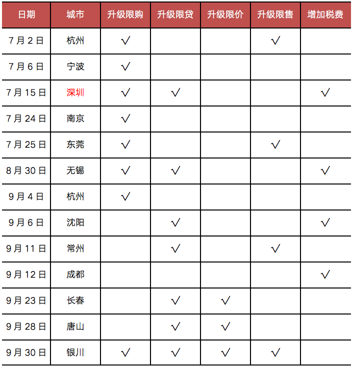 三季度最后一天的9月30日,銀川升級房地產(chǎn)調(diào)控政策,至此,參加7月24日座談會、8月26日城市會商會的14個城市中,除了北上廣以外11個城市全部完成了新政策出臺,而深圳政策力度最為嚴(yán)苛。
