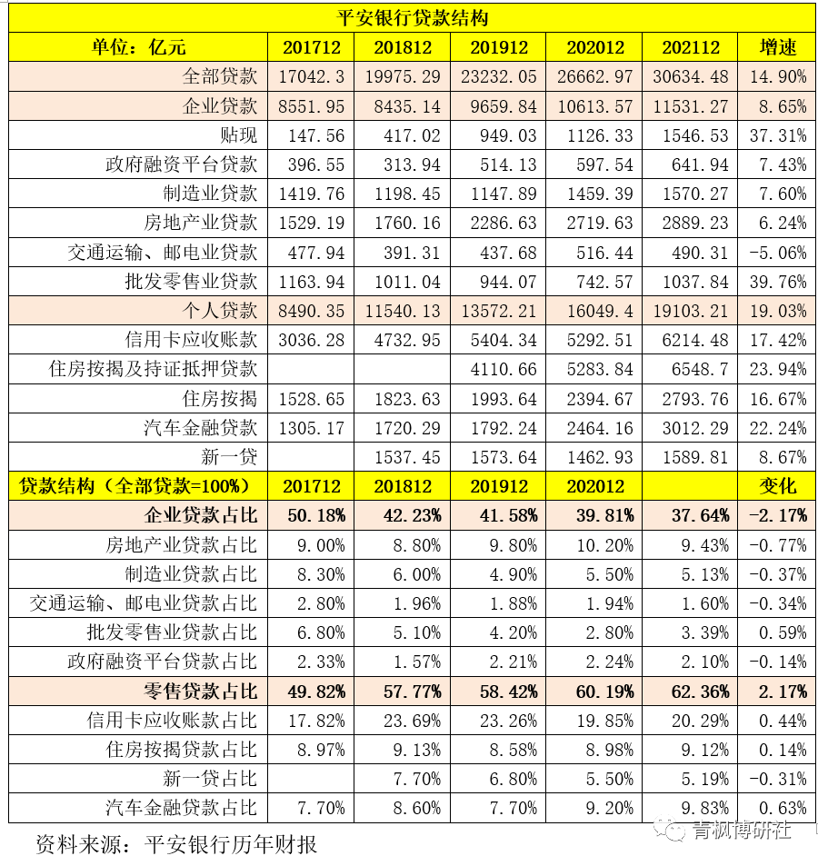 就2021年全年來看,平安銀行貸款占比有提升的子項主要有企業端的貼現與批發零售業貸款以及零售端的信用卡應收賬款、住房按揭貸款與汽車金融貸款。可以看出,信貸投向基本以零售端為主。