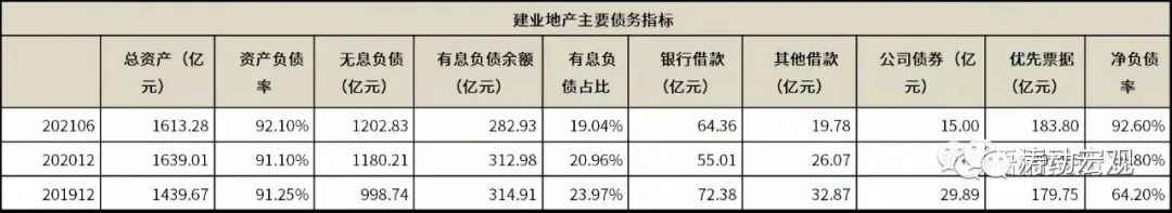 建業地產是建業集團的核心主體,2021年6月底資產負債率高達92.10%,較2020年底還上升了1個百分點,且2014年以來一直在80%以上、2019年以來更是持續居于90%以上,如此高的資產負債率表明建業地產本身一直將弦繃的太緊,很難承受較大且持續的外部環境沖擊,一旦項目受到影響出現進程放緩甚至中斷,則建業地產的流動性危機可能便會出現。
