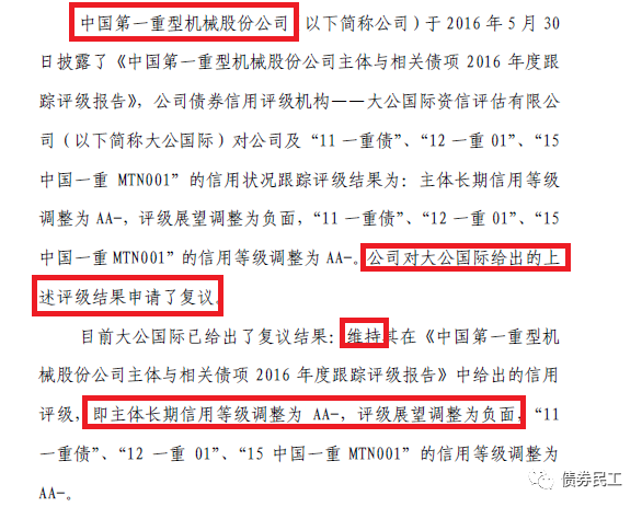 從實踐來看,信用債券市場上發(fā)行人對于評級機構的評級結果公開提出異議的情況并不多。債券民工印象中比較深的發(fā)行人對信用評級就結果公開提出異議并進行復議的是中國第一重型機械股份公司在2016年對評級結果提出了異議并進行復議,但是復議結果還是維持了主體長期信用等級為AA-,評級展望調整為負面的結果。