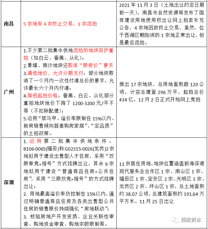 全國各城市第三批集中供地開展以來,在已經完成土拍的城市中,國企托市現象依舊非常明顯(例如無錫、寧波等城市),但流拍的情況也依然頻繁,比如南昌此次推出的5宗土地中,有4宗被終止了交易,唯一有房企參拍的土地也是以流拍告終。我們注意到,盡管第三批集中供地的土拍中不少城市均不同程度地降低了拍地條件,但房企仍舊沒有什么參與的熱情,比如南京放寬了參拍企業的資質要求(降低對聯合開發的限制,企業拿地資質由一級或二級降至三級)、不設置報名競買、合作開發和股份轉讓要求;蘇州下調了保證金和首付款比例、取消了土地的市場指導價、降低首繳土地出讓金比例;廣州南沙、黃埔取消限價政策,之前流拍的土地也下調了地價,允許開發商“分期付款”(詳見文末附圖)……