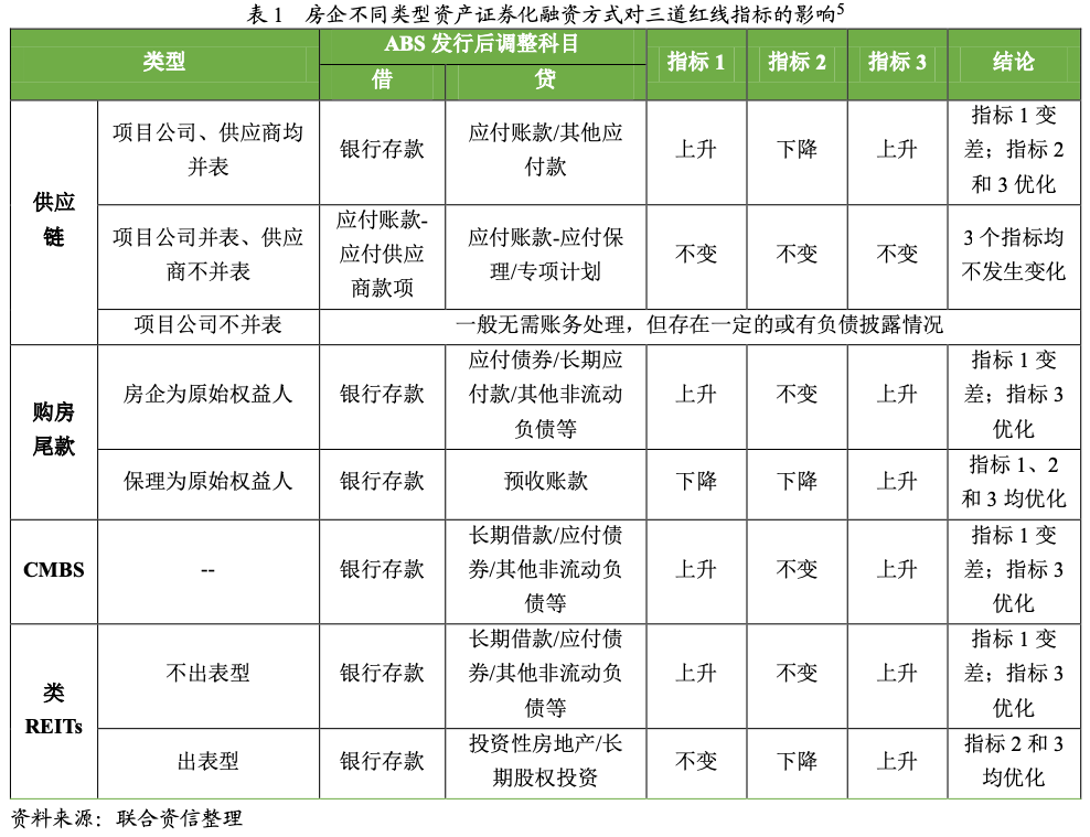 綜上所述,不同資產證券化產品類型對房企三道紅線的指標影響不同,且同種類型的ABS對三個指標的作用方向也存在不一致的情形,詳見下表。站在房企的角度上,應結合自身情況及距離各條紅線的安全距離,合理地選擇資產證券化融資方式,建立合理的資本結構。作為評級機構,應關注不同資產證券化產品類型對房企實際債務水平的影響,更準確的評估房企的真實債務壓力。