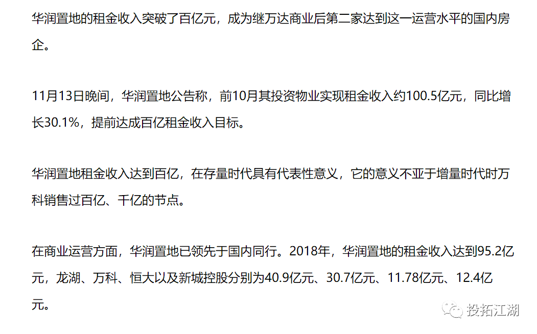國(guó)內(nèi)關(guān)注存量資產(chǎn),做商業(yè)運(yùn)營(yíng)的優(yōu)秀代表,如華潤(rùn)置地的租金收入已破百億,未來(lái)的市場(chǎng)大有可期。