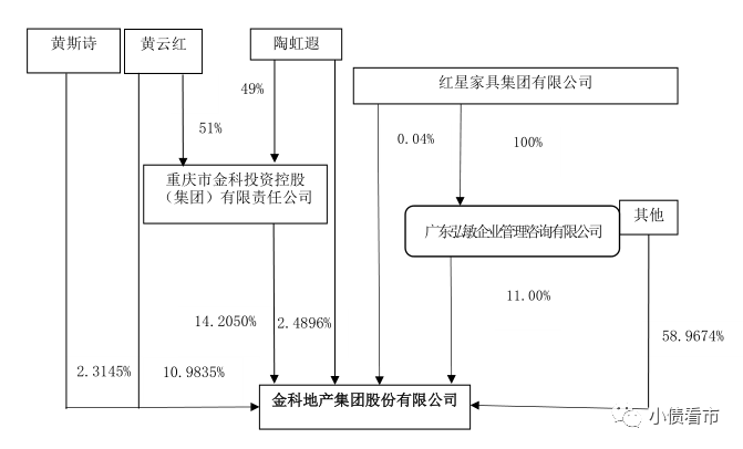 從股權(quán)結(jié)構(gòu)看,創(chuàng)始人黃紅云及其一致行動(dòng)人陶虹遐和黃斯詩(shī)間接和直接合計(jì)持有金科股份29.9926%的股權(quán),黃紅云為公司實(shí)際控制人。