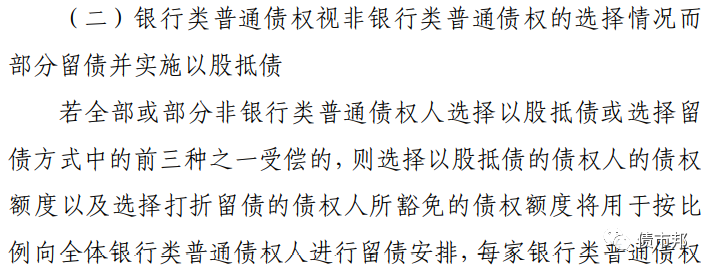 因?yàn)辂}湖的重整計(jì)劃是將一般債權(quán)人分為三個(gè)層級(jí)進(jìn)行對(duì)待的,優(yōu)先保障50w以下散戶的剛兌;其次是保護(hù)非銀投資機(jī)構(gòu)的利益,給予了現(xiàn)金清償跑路的權(quán)利;最慘的是商業(yè)銀行債權(quán),如果非銀機(jī)構(gòu)全部選擇現(xiàn)金清償,商業(yè)銀行的債權(quán)只能被迫債轉(zhuǎn)股。
