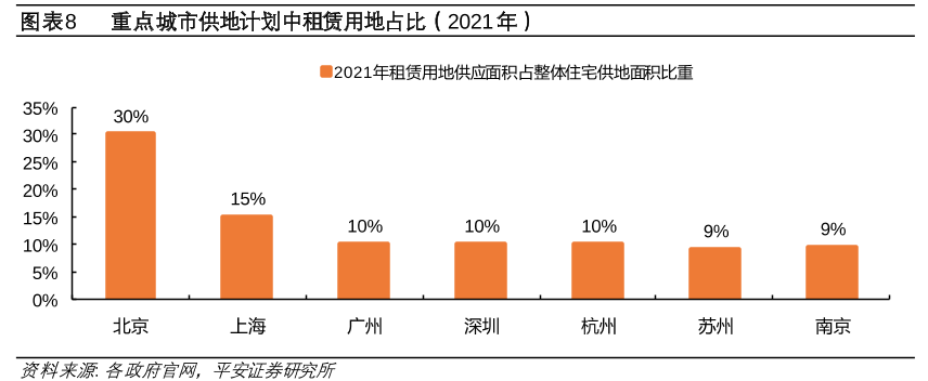 如上圖所示,2021年全國(guó)重點(diǎn)城市租賃住房用地的供應(yīng)面積,只有北京達(dá)30%,上海、廣州等其他城市位于9%~15%的水平,供應(yīng)規(guī)模在居住用地中的比例偏少,可見(jiàn)盡管監(jiān)管部門一再呼吁,但地方從源頭上做大租賃住房市場(chǎng)的動(dòng)力仍不足。