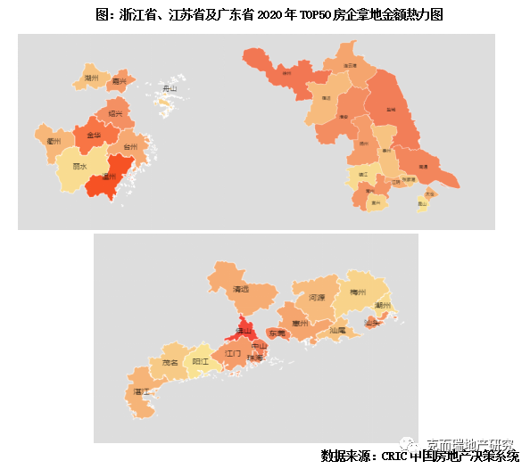 具體到城市層面而言,房企同樣更熱衷選擇強城進駐。以熱度最高的浙江、江蘇和廣東為例,可以發(fā)現(xiàn)房企投資也以一些具有產(chǎn)業(yè)支撐經(jīng)濟發(fā)達的城市為主,像浙江的溫州、金華、紹興,廣東的佛山、中山、東莞以及江蘇徐州、鹽城、南通等市,TOP50房企投資拿地均在百億以上,熱度要超過一些集中供地的二線城市。另外,一些省會城市例如陜西西安、云南昆明、廣西南寧等由于并未列入22城范圍之內(nèi),對省內(nèi)投資熱度起到了明顯的帶動作用。