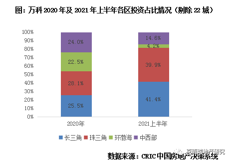 基于長三角、珠三角的發(fā)展前景,萬科下沉兩地非22城尋求投資契機。根據(jù)CRIC監(jiān)測,在保持了一定投資力度的前提之下,上半年萬科投資力度向非22城傾斜,占比相比2020年上升了9.3個百分點達到了62.0%,上半年并未在一線城市納儲。并且萬科則出現(xiàn)了非常典型的區(qū)域集中情況,2021年上半年,萬科非22城投資金額中超過8成投向了長三角、珠三角兩大區(qū)域,以金華、溫州、中山等熱點城市為主,相比2020年的均衡型投資有明顯調(diào)整。不過在6月底,萬科進行了新的組織架構變革,由五大區(qū)裂變成七大區(qū),主要是將北方區(qū)域裂變?yōu)楸本|北,中西部裂變成華中、西南區(qū)域,組織先行,未來企業(yè)仍有望擴大兩地拿地份額。