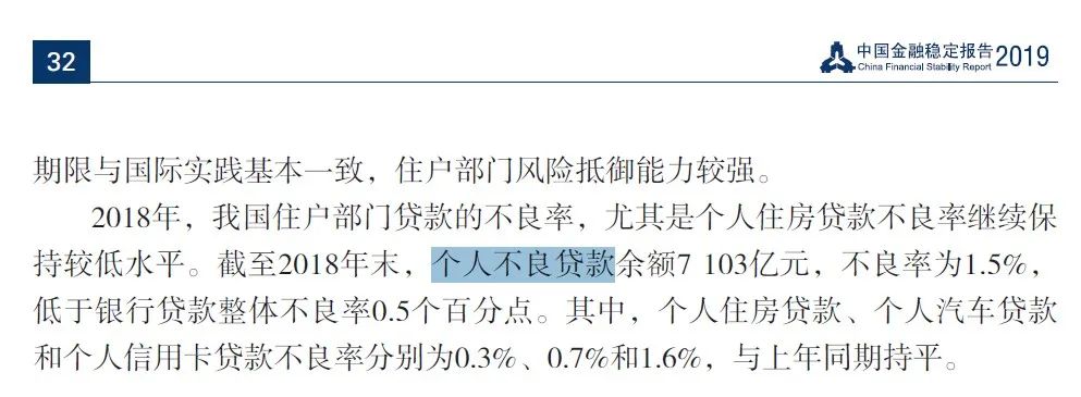 中國人民銀行會于每年9月左右發布當年的《中國金融穩定報告》,數據為之前一年。而自2020年起,該報告便不再公布個人不良貸款余額。2019年公布的2018年末個人不良貸款余額為7,103億元,不良率為1.5%。而該報告中當年銀行業金融機構不良貸款余額(包含但不限于商業銀行不良貸款余額)為2.84萬億元。因此個人不良貸款占不良貸款約為25.01%.