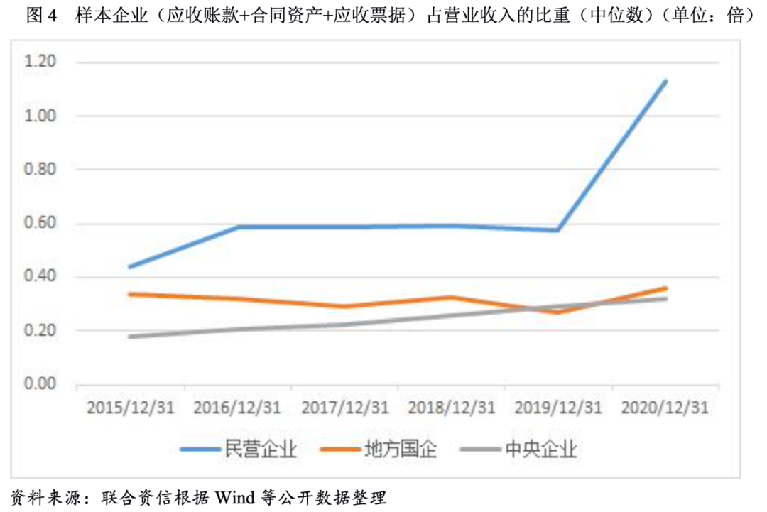 我們以“(應(yīng)收賬款+合同資產(chǎn)+應(yīng)收票據(jù))/營業(yè)收入”(中位數(shù))指標(biāo)來衡量下游業(yè)主對建筑施工企業(yè)的占款情況。2015年以來,建筑施工企業(yè)該指標(biāo)整體呈上升趨勢。其中:中央企業(yè)和地方國企該指標(biāo)增長趨勢較為平緩;民營企業(yè)由于話語權(quán)最弱,該指標(biāo)最高且2020年增幅顯著,或受房地產(chǎn)企業(yè)流動性趨緊影響最大。