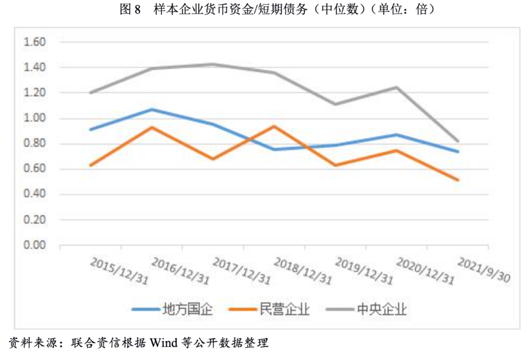 自2015年以來,建筑施工企業(yè)貨幣資金對短期債務(wù)的覆蓋程度整體呈波動下降趨勢。其中,中央企業(yè)貨幣資金對短期債務(wù)的覆蓋程度最高;民營企業(yè)貨幣資金對短期債務(wù)的覆蓋程度一直在1倍以下,其貨幣資金對短期債務(wù)覆蓋程度最低,2021年9月底該指標(biāo)降至0.51倍,達(dá)到自2015年以來的最低值。