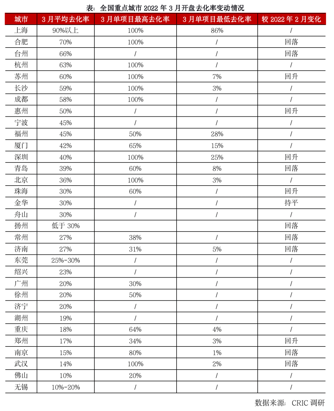 從CRIC調研的全國重點城市3月開盤去化率情況來看,高于60%僅有5城,分別為上海、合肥、臺州、杭州、蘇州,主要集中在長三角經濟相對發達的區域;而變化情況來看,總體呈現出跌多漲少,部分城市諸如南京等受疫情負面波及較大,開盤去化率階段性回調;而青島、濟南、揚州等更多城市則呈現出客戶消費欲望低,整體觀望情緒加重,即便以價換量也難挽成交頹勢。僅有少數城市蘇州、惠州、深圳、珠海、鄭州等3月開盤去化率穩步回升。