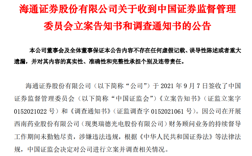 主要原因在于海通證券在開展西南藥業股份有限公司(現奧瑞光電股份有限公司)財務顧問業務的持續督導工作期間,未能勤勉盡責,涉嫌違法違規決定,對其進行立案調查。