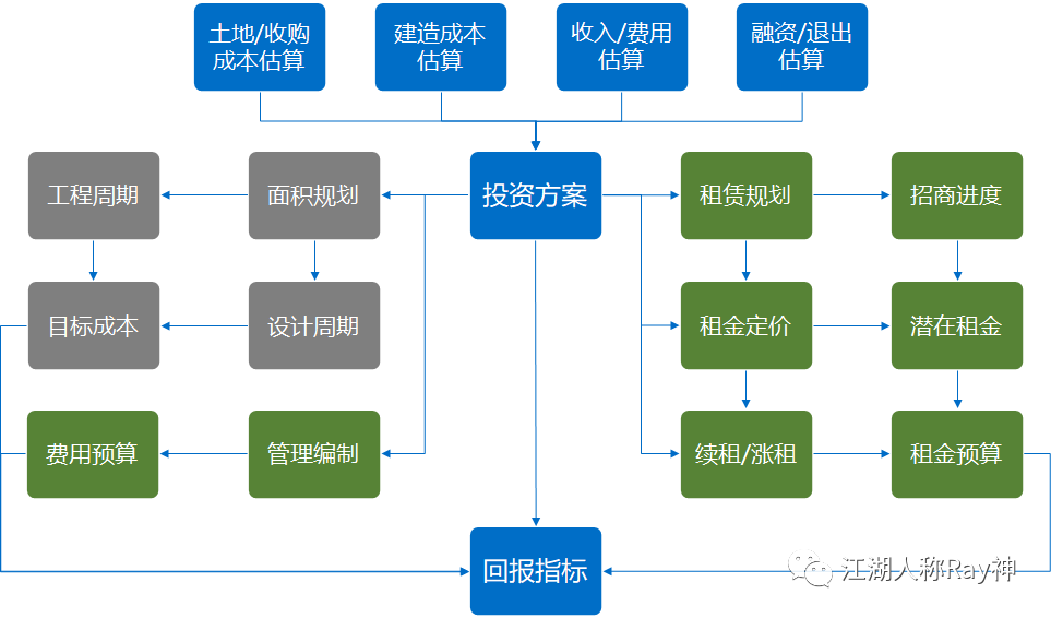 在我看來,投資測算的目的不在于測算那些財(cái)務(wù)指標(biāo)能不能達(dá)到老板的預(yù)期,而是規(guī)劃項(xiàng)目要怎么做才能達(dá)到老板的預(yù)期。也就是說,投資測算的過程其實(shí)是一個(gè)模擬未來項(xiàng)目的操盤方式的過程,包括:樓要怎么建、花多少錢建、建多久、建好后怎么招商、租金定多少、每年花多少費(fèi)用、要不要融資等等。