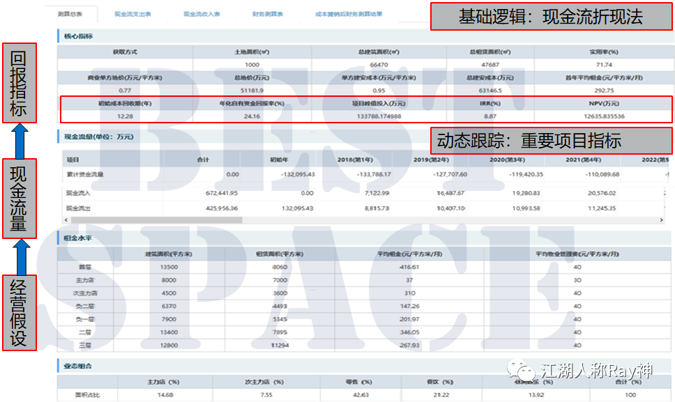 而至于各項(xiàng)現(xiàn)金流如何更有效、更科學(xué)地預(yù)估出來,這就要結(jié)合企業(yè)自身所投資的項(xiàng)目的特征來設(shè)計(jì)了。比如:投資住宅會(huì)根據(jù)推盤計(jì)劃和回款預(yù)估收入現(xiàn)金流,投資酒店會(huì)根據(jù)淡旺季房價(jià)與空房率預(yù)估,寫字樓、購物中心、長租公寓預(yù)估租金的方式方法也有所差異等。各種投資測算的工具,其本質(zhì)就是結(jié)合具體的業(yè)務(wù)特點(diǎn)設(shè)計(jì)了一套預(yù)估現(xiàn)金流的方法。
