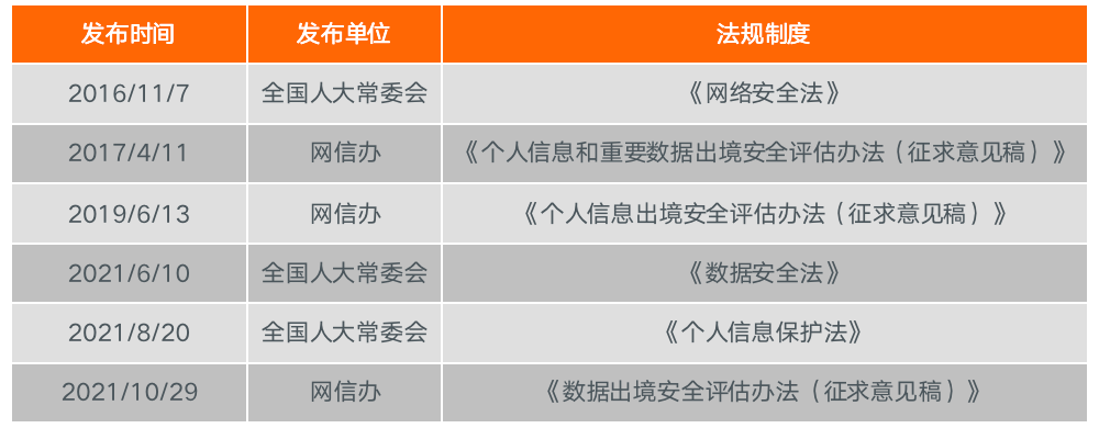 2016年11月7日,《網(wǎng)絡(luò)安全法》正式頒布,首次明確了數(shù)據(jù)出境需進行安全評估。之后,網(wǎng)信辦分別于2017年和2019年發(fā)布了《個人信息和重要數(shù)據(jù)出境安全評估辦法(征求意見稿)》和《個人信息出境安全評估辦法(征求意見稿)》,但由于《數(shù)據(jù)安全法》和《個人信息保護法》尚未實施,以上兩個評估辦法缺乏法律基礎(chǔ),一直未出臺正式文件。