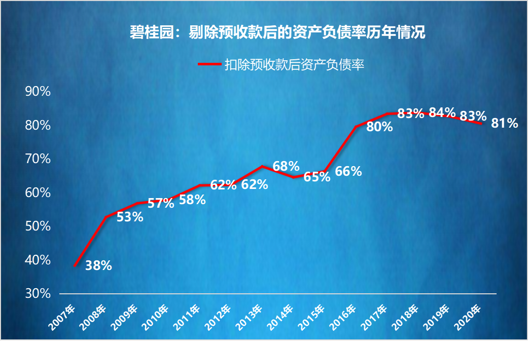2016年之前,碧桂園剔除預收款后的資產負債率維持在70%以內。2016年開始,增加到80%以上,并且一直維持。