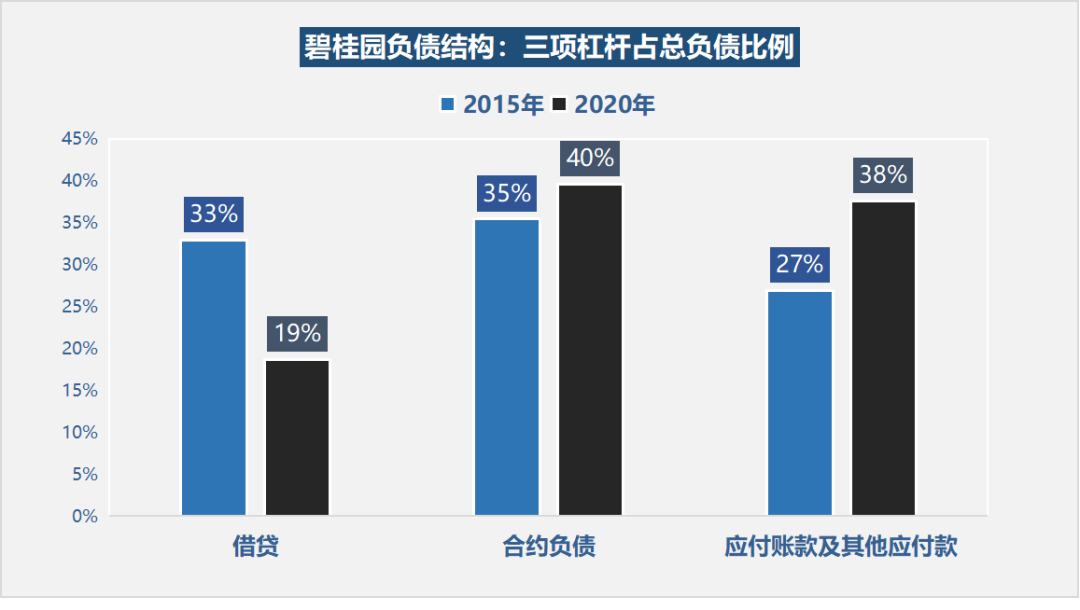 從2015年以來碧桂園的杠桿比例可以看出:借貸在總負債比例中下降明顯,而應付賬款和其他應付款明顯上升。