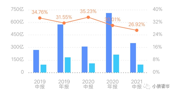 近年來(lái),受結(jié)轉(zhuǎn)項(xiàng)目區(qū)域分布影響,龍光集團(tuán)整體營(yíng)業(yè)毛利率呈下行趨勢(shì),2021年中期降至26.92%,但得益于良好的項(xiàng)目布局,整體保持在較高水平。