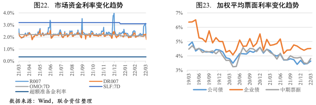 市場流動性合理充裕。2022年一季度央行穩健的貨幣政策靈活適度,更加主動有為,引導金融機構加大對實體經濟的支持力度,保持了市場流動性合理充裕。面對因春節假期、繳準、稅期、財政收支及政府債發行等因素導致的短期資金面擾動,央行通過靈活開展公開市場操作維持資金面穩定,保持銀行體系流動性合理充裕,存款類金融機構7天質押式回購利率(DR007)等短期市場利率圍繞政策利率中樞小幅波動。企業融資成本穩中有降。1月17日央行下調MLF和7天逆回購利率10個基點,帶動1年期、5年期LPR報價分別下調10個和5個基點。受此影響,一季度企業貸款利率下行至4.4%,較上年同期下降21個基點[4];公司債、企業債和中期票據加權發行利率穩中有降。展望后市,央行穩健的貨幣政策將更加積極有為,保持市場流動性合理充裕,同時引導金融向實體經濟合理讓利,推動企業融資成本進一步降低。