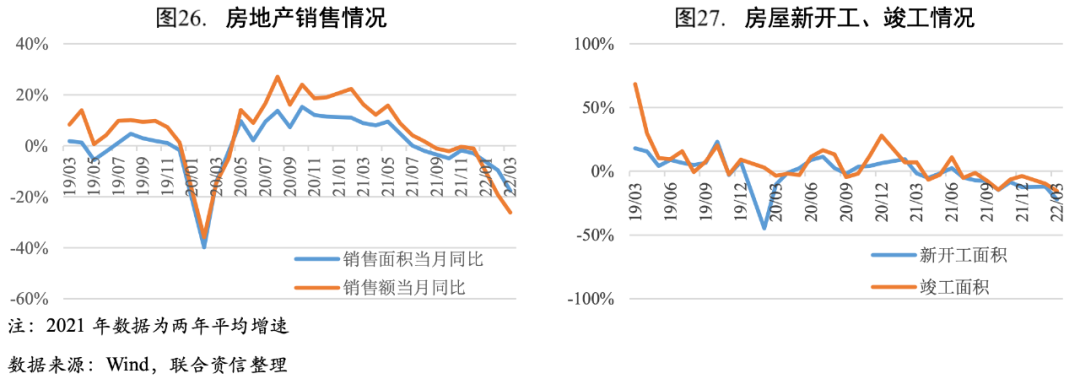 2022年一季度房地產銷售持續下探。2022年以來,多地適度放開限購限售,降低公積金使用門檻、調降房貸利率、加快房貸審批節奏,但在政策放松的同時,一季度房地產銷售面積與銷售額同比下降超過10%,3月銷售額同比下降至26.16%。房地產銷售端惡化抑制房地產投資,房企對于拿地、新開工也較為謹慎。