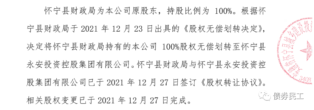 7、根據安徽省懷寧縣城鄉建設投資發展有限責任公司(主體信用等級AA-)2022年1月20日的公告,懷寧縣財政局決定將其持有的公司100%股權無償劃轉給懷寧縣永安投資控股集團有限公司。懷寧縣永安投資控股集團有限公司未發行過債券。