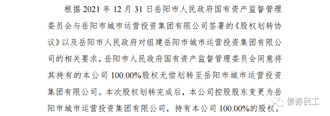 11、根據岳陽市交通建設投資集團有限公司(主體信用等級AA)2022年1月7日公告稱,公司股東變更為岳陽市城市運營投資集團有限公司。岳陽市城市運營投資集團有限公司未發行過債券。