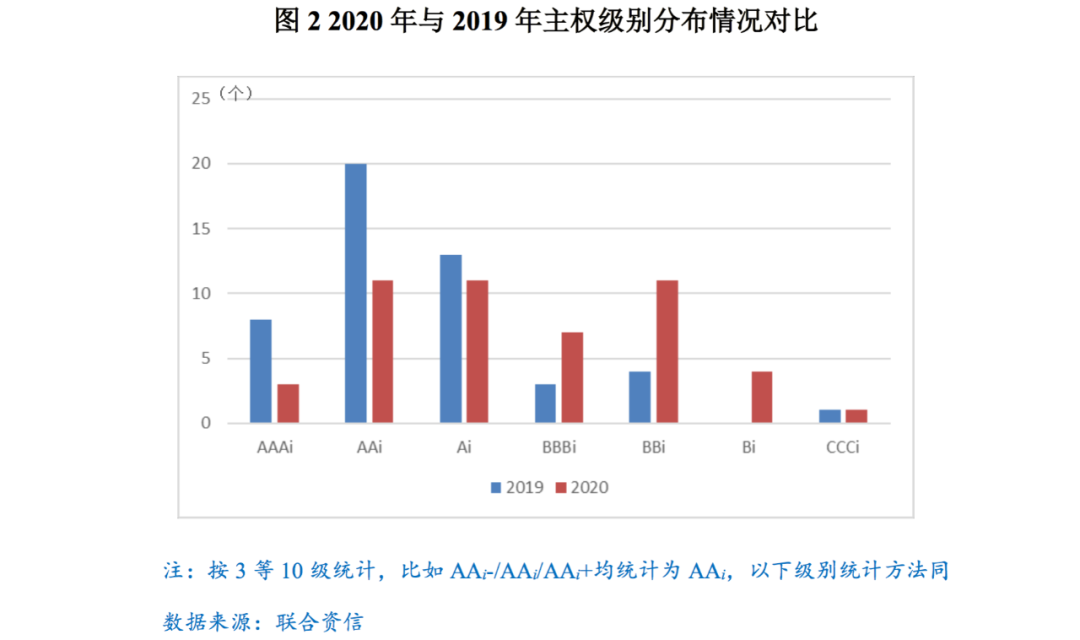 從級別分布看, 2020年受評國家整體級別中樞下移的趨勢較為明顯。由圖2可以看出,在跟蹤國家數基本持平的前提下,與2019年的級別分布相比,2020年,AAAi級國家減少5個,AAi級減少9個,Ai級國家減少2個;同時,BBBi級增加4個,BBi級增加7個,Bi級增加4個,CCCi級仍為1個。
