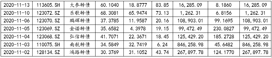 2020年11月可轉債共上市發(fā)行15只,發(fā)行金額237.77億元,月環(huán)減少89.43億元;8家主體到期,償還金額0.79億元;凈融資額 235.98億元。