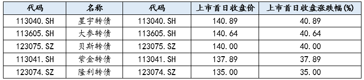 2、上市的21只轉債首日均收漲,漲幅前五的轉債為: