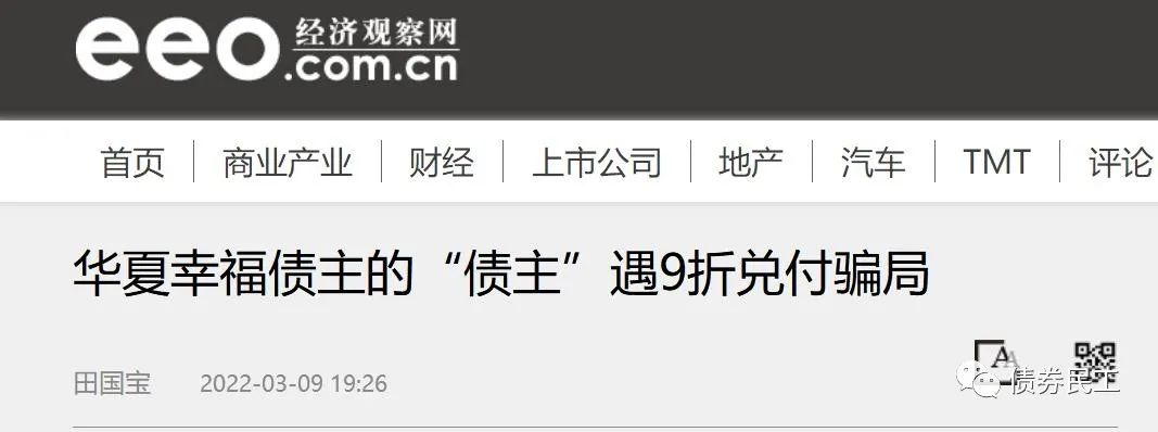 根據經濟觀察網2022年3月9日的報道,華夏幸福債主的“債主”遇9折兌付騙局。