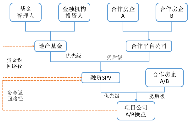 (2)資金路徑方面,資金方和融資房企應當采用1:1等額比例,共同將資金投入合伙型基金。為確保資金方資金安全,融資房企的資金應當先于資金方資金投入合伙型基金及項目公司,在項目后續開發期間融資房企與資金方共同承擔后續開發資金的補足義務。待項目公司開發完畢,項目公司完成利潤清算,優先將利潤分配至合伙型基金及作為優先級LP的資金方。