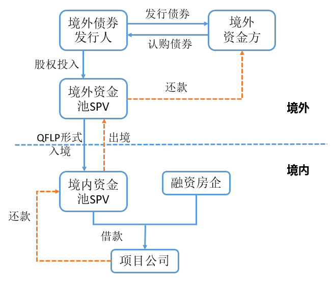 有融資需求的房企可在境外離岸港設立SPV作為境外債券發行人,向境外資金方發行私募債券,境外資金方認購私募債券后,境外發行人通過股權投資形式將資金投入境外資金池,境外資金池通過股權形式將資金投入境內資金池,同時境內資金池將資金投入境內項目公司,融資及還款路徑如下圖所示: