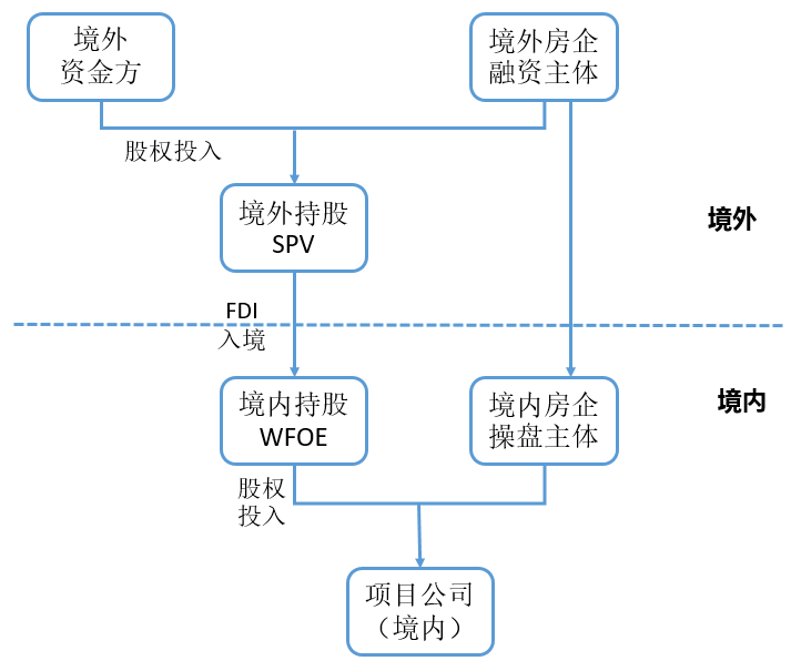 境外真股融資模式與境內的真股融資模式路徑相同,同樣是由境外資金方與境外融資房企在境外設立SPV,雙方的資金由境外持股SPV通過FDI途徑將資金實繳至境內持股外商投資企業,隨后該境內持股WFOE與境內操盤房企主體共同持有項目公司股權并開發項目。資金的入境路線如下: