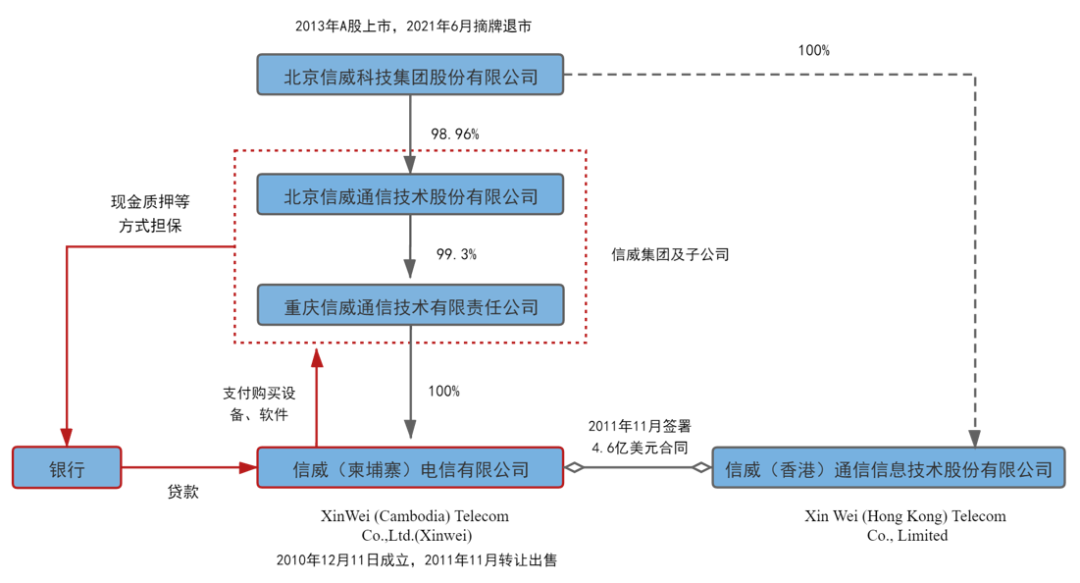 以柬埔寨地區為例,信威集團在上市之際在當地的主要合作方和利潤來源都是“信威(柬埔寨)電信有限公司”,英文名XinWei (Cambodia) Telecom Co.,Ltd.(Xinwei)。由信威集團子公司重慶信威通信技術有限責任公司在2010年12月設立。2011年10月,重慶信威對外轉讓了該公司全部股權。