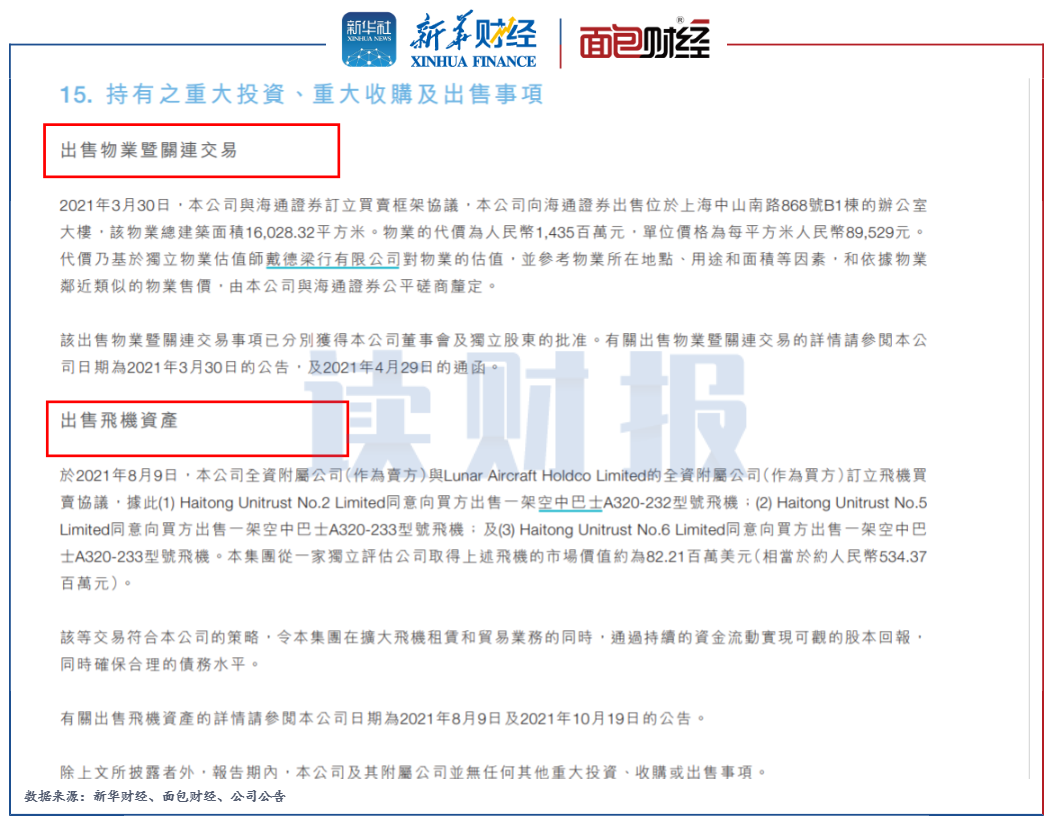此外,根據(jù)海通恒信2021年年報,該公司當(dāng)年發(fā)生兩次重大的出售事項,一次是向海通證券出售辦公室大樓,一次是出售2架飛機(jī),上述資產(chǎn)的評估價值分別為14.35億元和5.34億元。