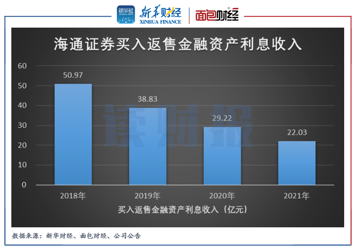 此外,買入返售金融資產(chǎn)和融出資金也是海通證券確認(rèn)信用減值損失的主要風(fēng)險點。2021年,海通證券買入返售金融資產(chǎn)占總資產(chǎn)的5%,融出資金占總資產(chǎn)的10%,較上年占比分別下降約3%和1%。當(dāng)期,公司的買入返售金融資產(chǎn)利息收入為22.03億元,同比減少超兩成。