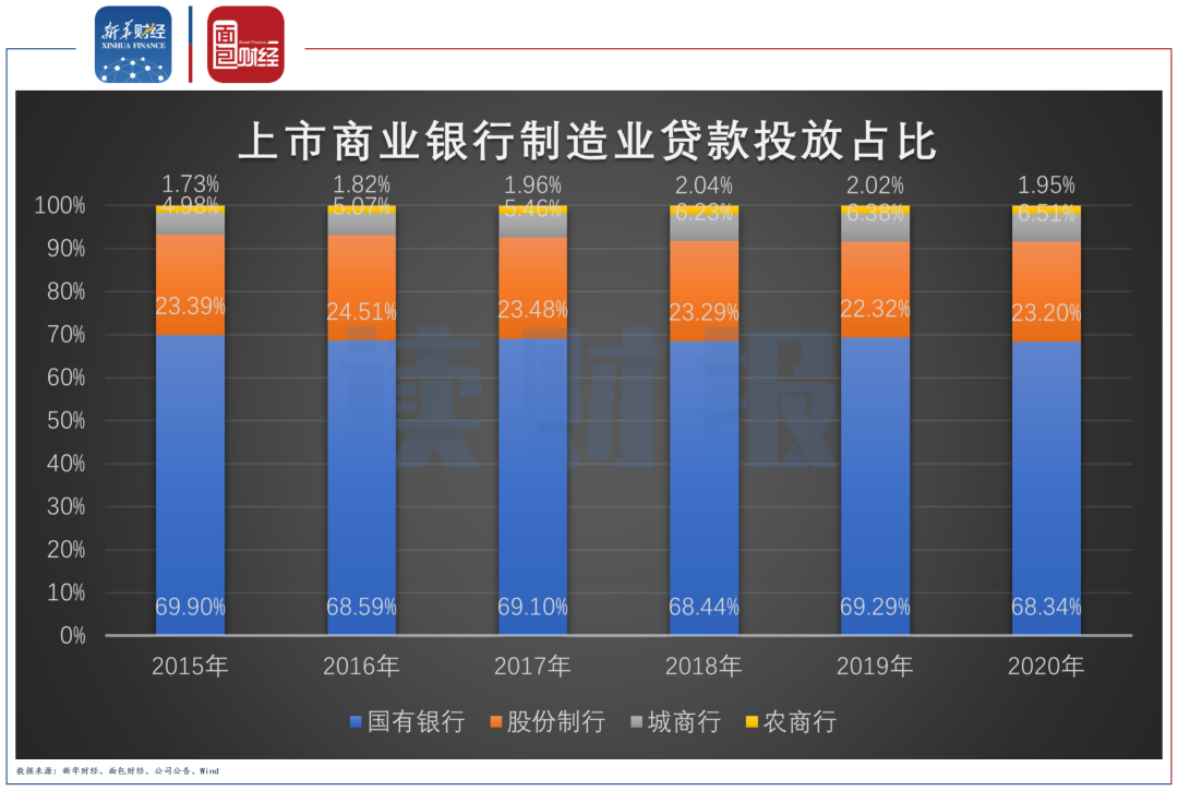 城商行和農(nóng)商行的制造業(yè)貸款投放占比相對較小,截至2020年末,城商行和農(nóng)商行的制造業(yè)貸款占比分別為6.51%和1.95%。