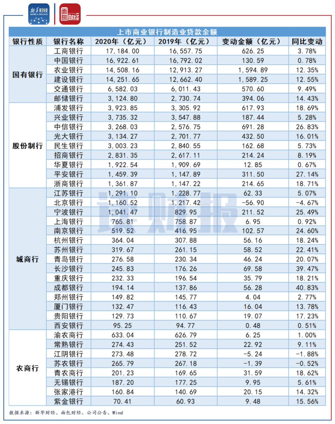 與2019年末相比,2020年各家國有銀行和股份制銀行的制造業(yè)貸款余額均出現(xiàn)增長,但增速差異較大;城商行和農(nóng)商行中則有個別銀行的貸款余額出現(xiàn)下降。