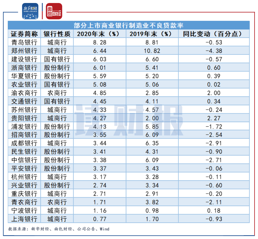 針對A股38家上市商業(yè)銀行2020年報制造業(yè)貸款情況,新華財經(jīng)和面包財經(jīng)研究員從余額、增速、占比以及不良率等角度進行了梳理。
