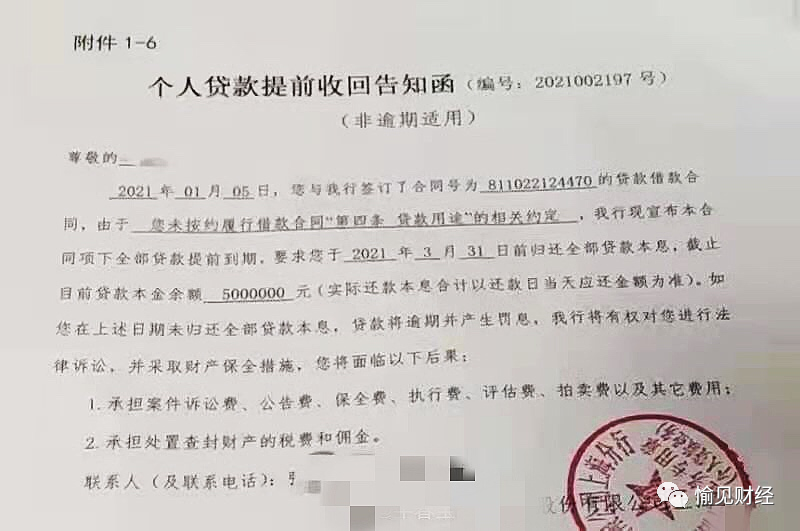 喏,不是已經有某股份制銀行上海分行對“貸款用途”有問題的個貸在發提前收回函了么。這貸款人估計也是頭大了,500萬要在月底前籌出來,否則還要產生罰息。