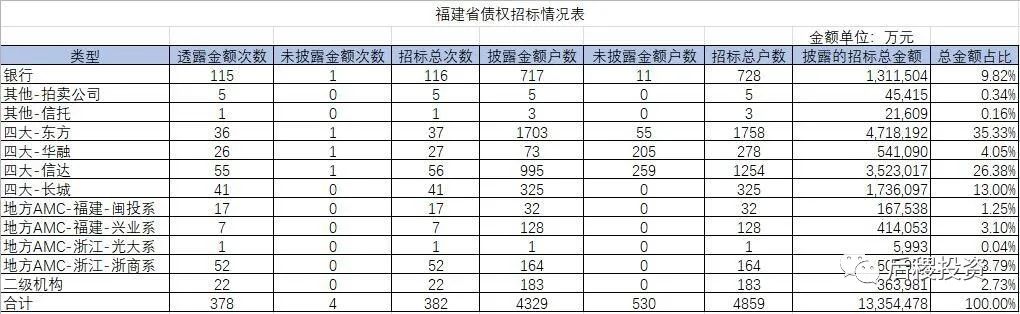 從上表可以看出,債權招標較多的還是四大全國AMC,其中東方的招標總額最高,為471億元左右,信達長城次之,華融則較少。銀行的招標規模由于直接面向持牌AMC的未公開的情況較多,故參考意義不大。本省及外省地方持牌AMC在當地的招標則較少。
