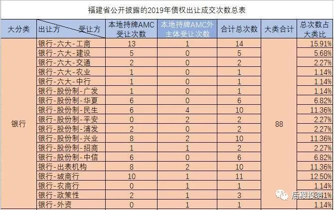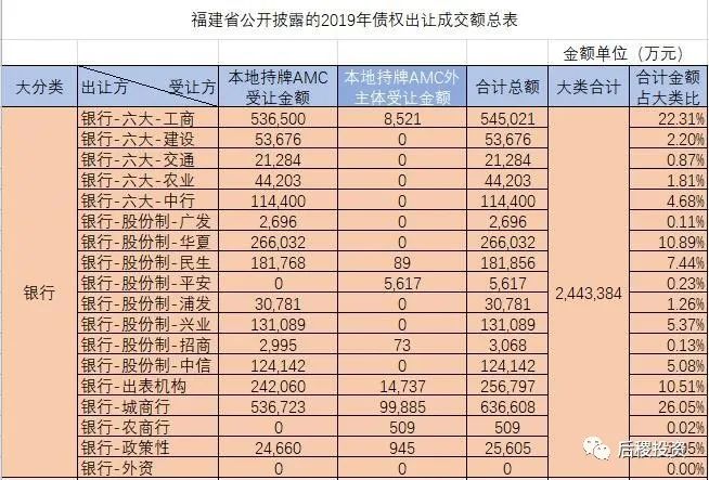 a、單從金額上看,2019年福建省一級市場銀行出讓債權總金額約244億元左右,其他機構約25億元左右,合計269億元左右,由于有關信達的金額數據缺失,故此金額應當更高(信達的實際受讓金額按與其他AMC的戶數比例推算,應當在25-30億之間)。對比2018年的380億元左右,規模大幅下降。
